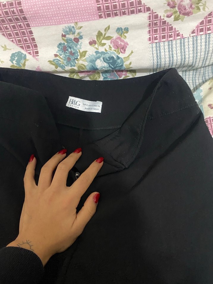 Düğmeli, midi boy, siyah kadın kumaş pantolon. İnce kesim ve ipeksi dokusu ile iş ve gündelik kullanıma uygundur.