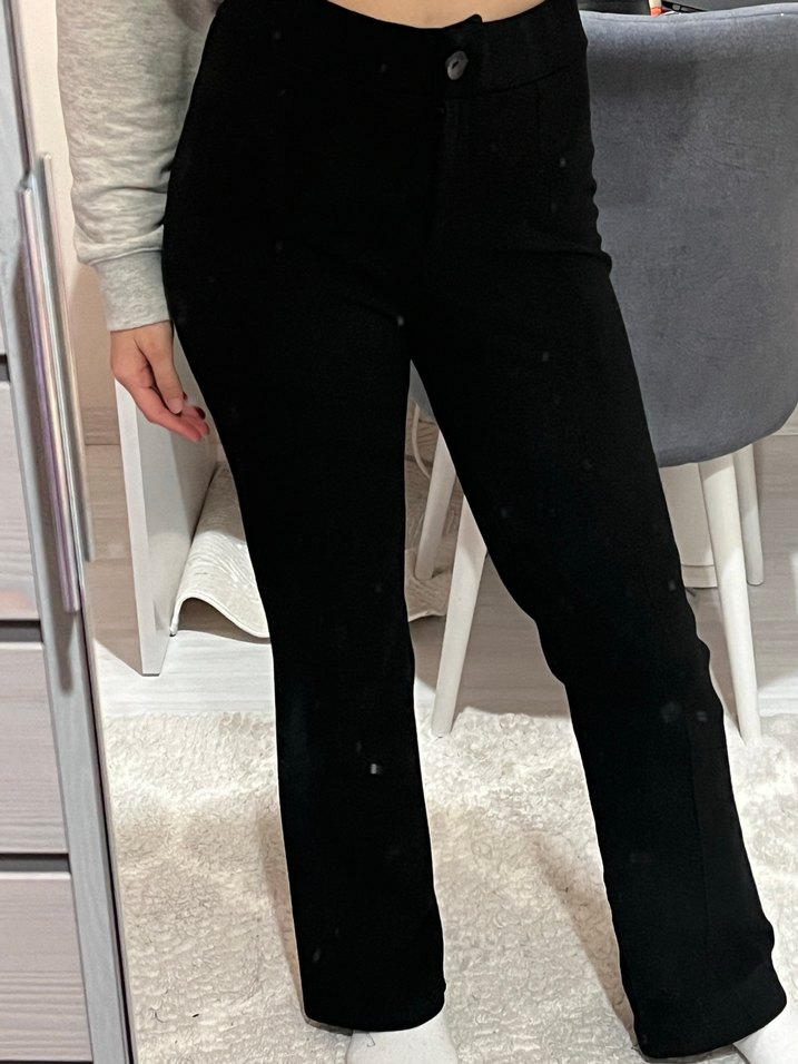 Düğmeli, düz siyah kadın kumaş pantolon. Normal boy ve regular fit kesime sahip, ofis için uygun.