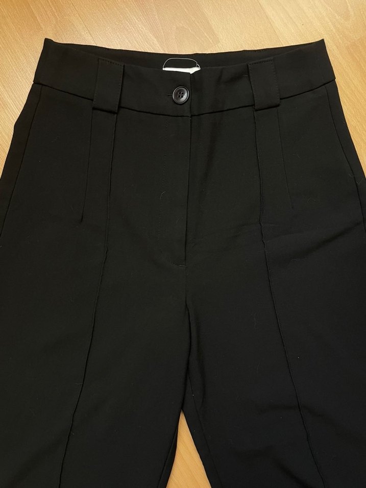 Düğmeli, midi boy, düz siyah kadın kumaş pantolon. Sentetik kumaştan, ofis kullanımı için uygun, sade ve düzenli bir tarz sunar.