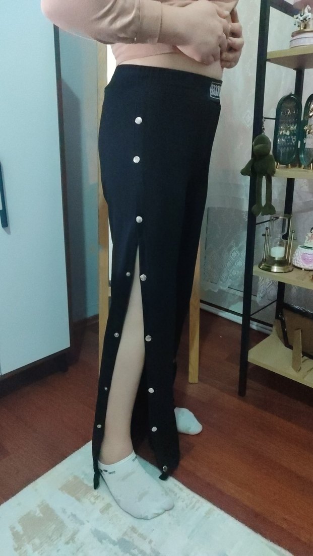 Düğmeli detaylara sahip, uzun ve dar kesim siyah kadın kumaş pantolon, sokak modası ve athleisure tarzını günlük kullanım için birleştiriyor.