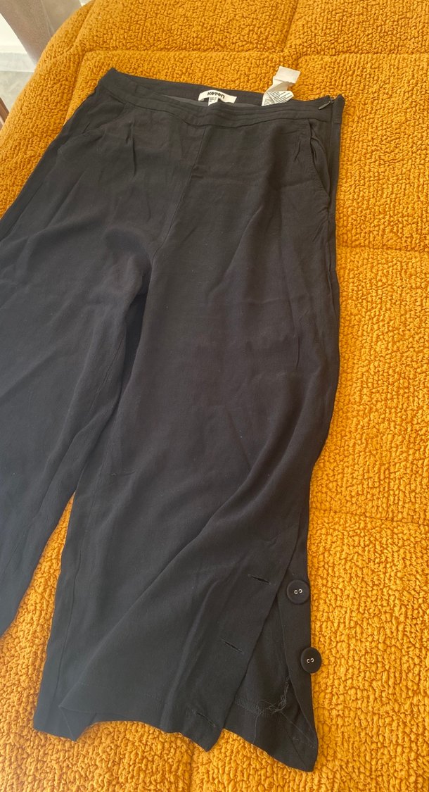 Düğmeli detaylara sahip, midi boy, siyah kadın kumaş pantolon. Rahat kesimi ve düz dokusu ile günlük açık hava kullanımı için uygundur Yandan gizli fermuar detaylı yüksek bel bol paça vizyon kumaş aşırı rahat 34-36 beden rahat olur