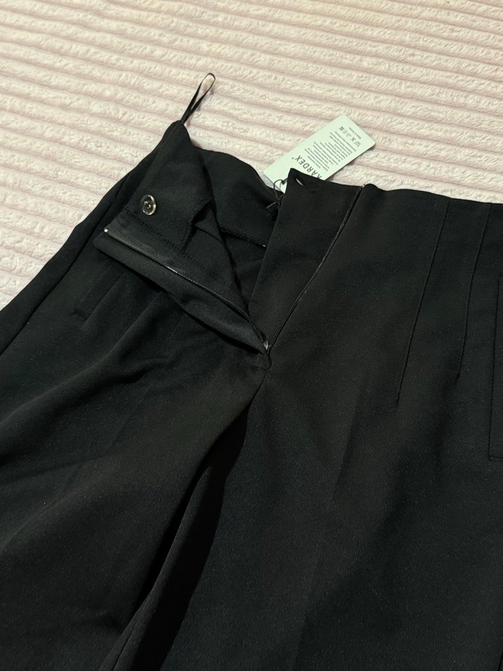 Kadınlar için siyah kumaş pantolon, düğmeli ve regular fit kesime sahip. Sentetik kumaştan üretilmiş, midi boyda, ofis ve günlük kullanım için uygun.