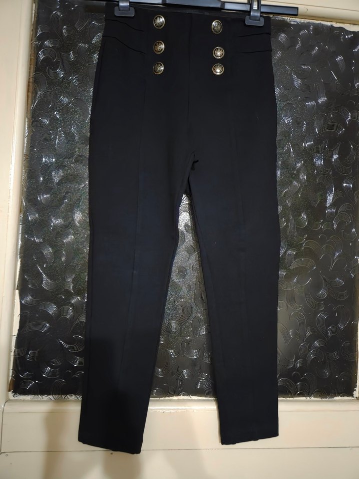 Düğmeli detaylı, siyah kadın kumaş pantolon. Normal boy ve regular fit. Ofis ve günlük sokak stiline uygun,biraz kalın ve sentetik kumaştandır.