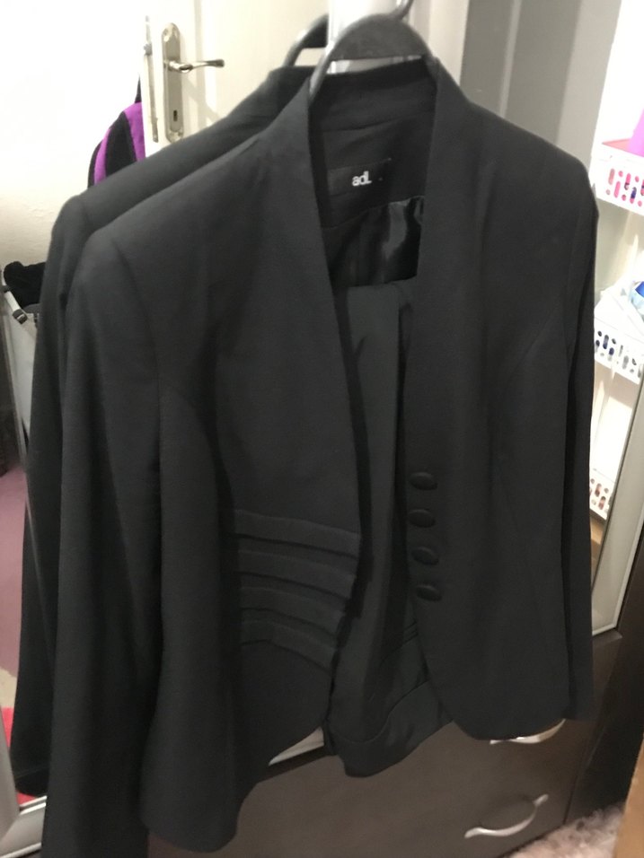 Düğmeli ve uzun kollu siyah kadın blazer, normal kesim ve ipeksi dokusuyla ofis için uygun, gotik tarzda midi uzunlukta.