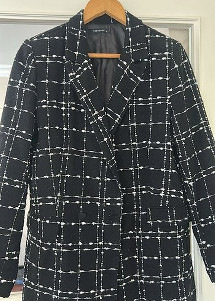 Düğmeli ön kısmı ve kesik yaka detaylı siyah kadın midi blazer ceket. Normal kesim ve uzun kolludur, ofis ve günlük kullanıma uygundur. Sentetik kumaştan, hafif kare desenlidir.