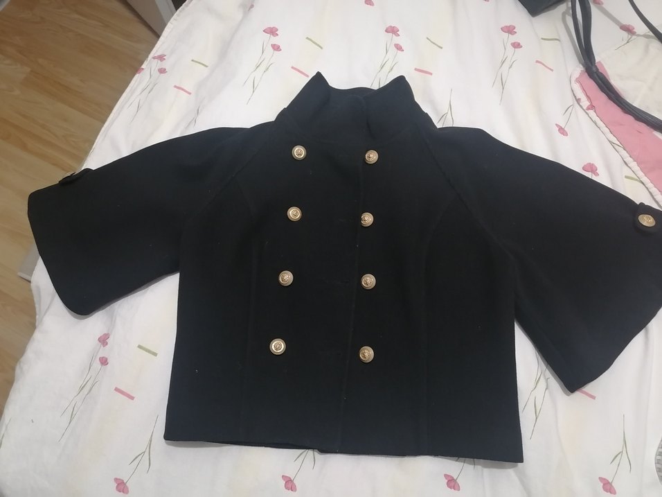 Düğmeli ve yakalı, uzun kollu siyah kadın kaban . Orta boy ve vücuda oturan kesime sahip, yumuşak ve sıcak kumaştan üretilmiştir.