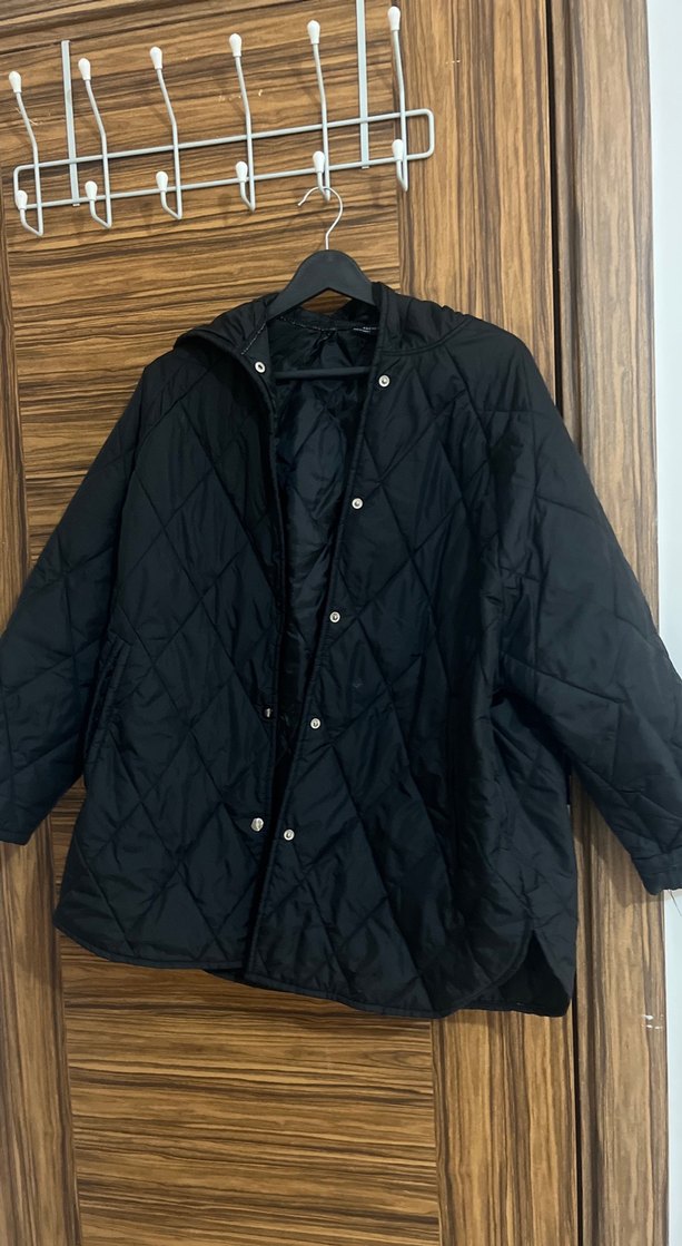 Düğmeli, uzun kollu, siyah midi ceket. Gevşek kesimli, keten kumaştan rahat ve desensiz, şık günlük sokak stili için uygun.