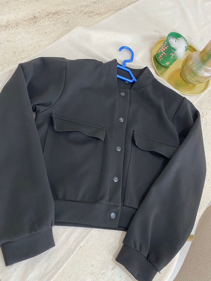 Düğmeli ön kısmı ve yuvarlak yakası olan siyah kadın ceketi. Uzun kollu, bol kesim ve yumuşak, sıcak kumaştan yapılmıştır. Minimalist tarzda günlük kullanıma uygundur.