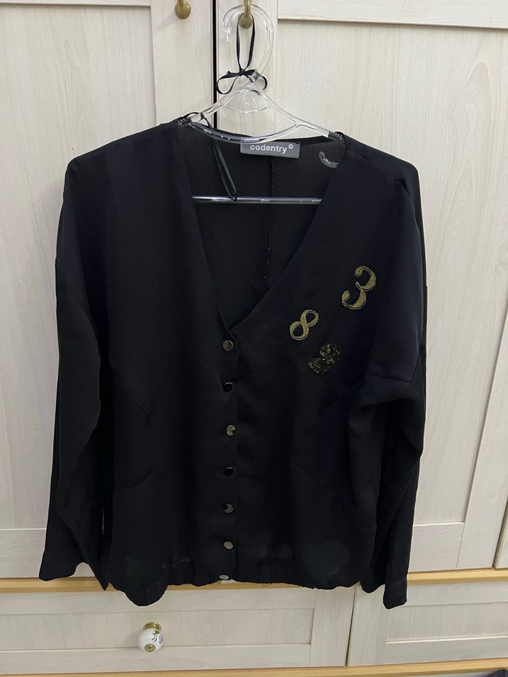 Kadınlar için düğmeli, uzun kollu ve normal uzunlukta siyah midi ceket. Satenimsi kumaştan, bol kesim ve ofis kullanımı için uygun.
