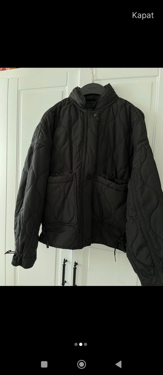 Düğmeli, yüksek yakalı ve uzun kollu siyah keten ceket. Salaş kesimi ve midi boyu sokak modasına uygundur.