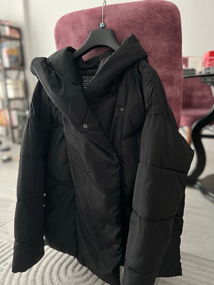 Yumuşak fleece kumaştan, düğmeli ve yüksek yakalı siyah kadın midi kış montu. Rahat kesimiyle günlük kullanıma uygundur.