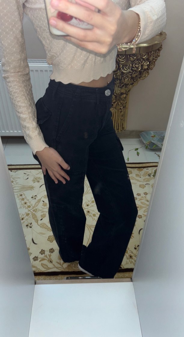 Pamuklu, düğmeli, siyah, bol kesim midi kot pantolon. Günlük sokak stili için rahat ve şık.