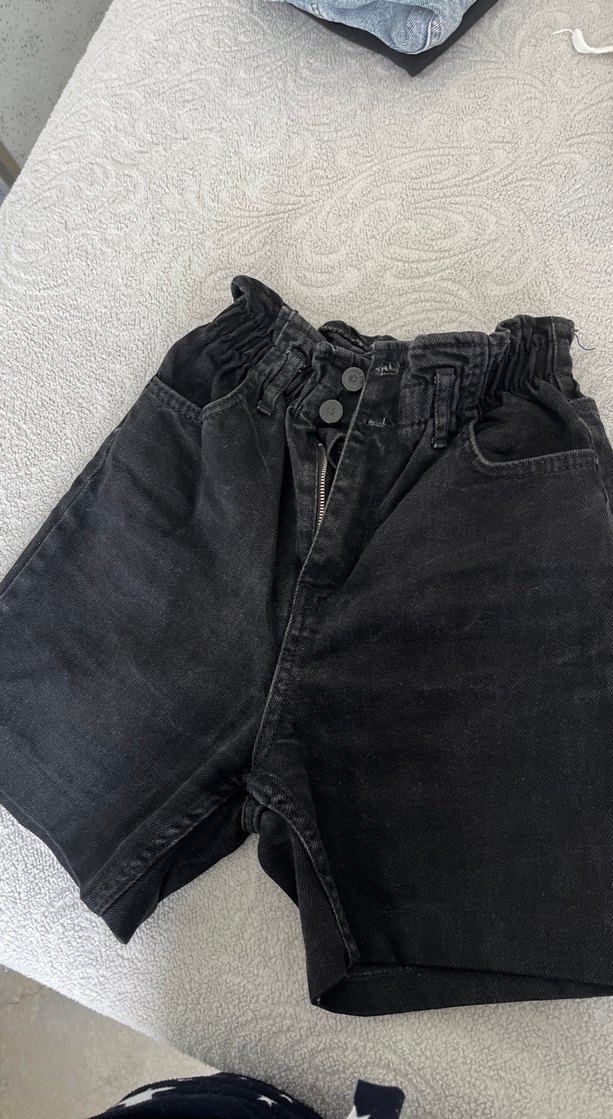 Düğmeli kapama ve büzgülü bel detaylı, bol kesim siyah denim midi şort. Günlük rahat ve şehir stiline uygun.