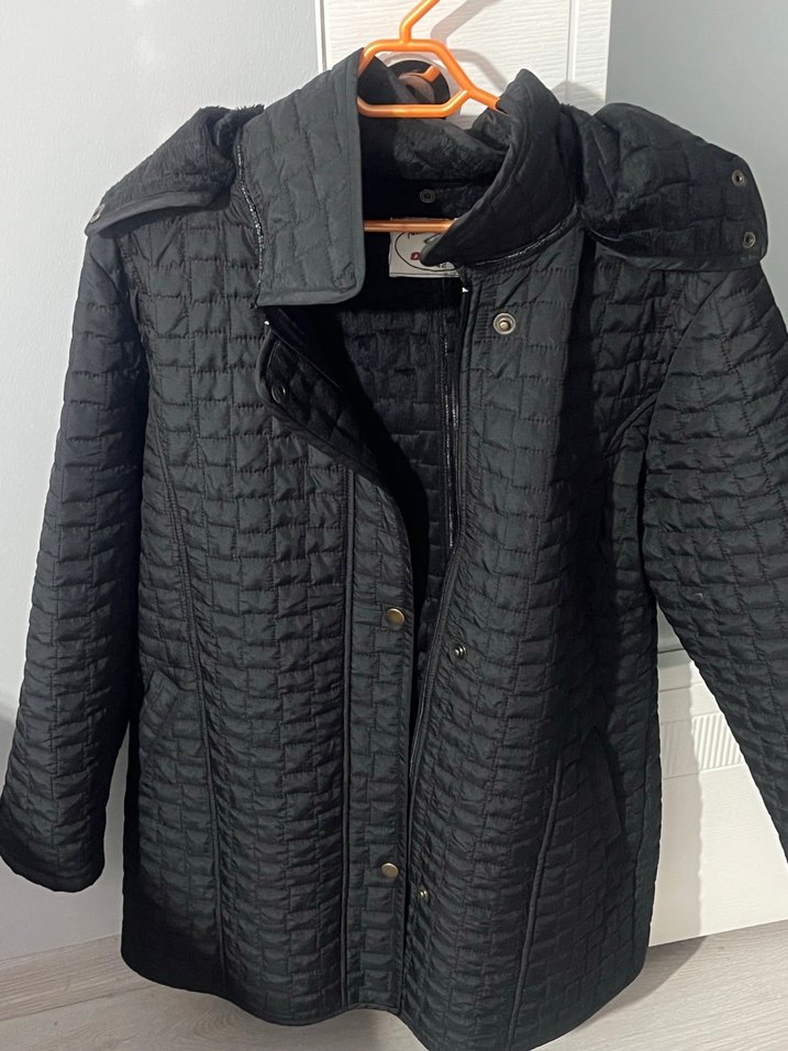 Düğmeli ön kısmı ve kesik yaka detayı olan siyah kadın mont. Uzun kollu, normal kesim ve midi boyda, sentetik kumaştan rahat ve günlük kullanıma uygun sıcak bir parça. 40-42 beden uyumlu