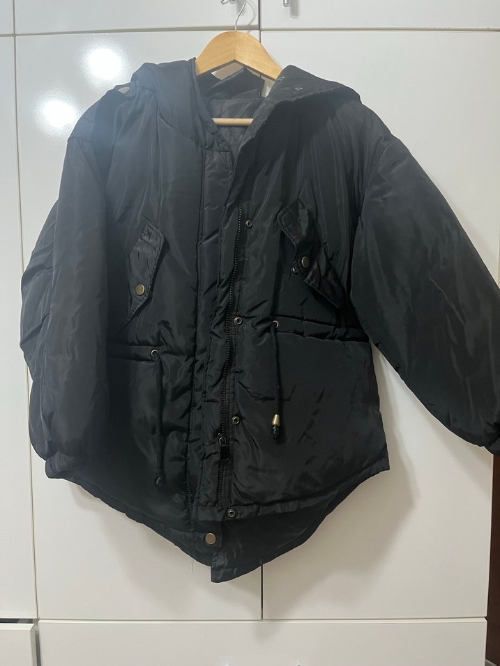 Düğmeli, uzun kollu, siyah midi mont, bol kesim ve kesik yaka detayına sahip. Sokak stiline uygun, yumuşak ve sıcak kumaştan üretilmiştir.