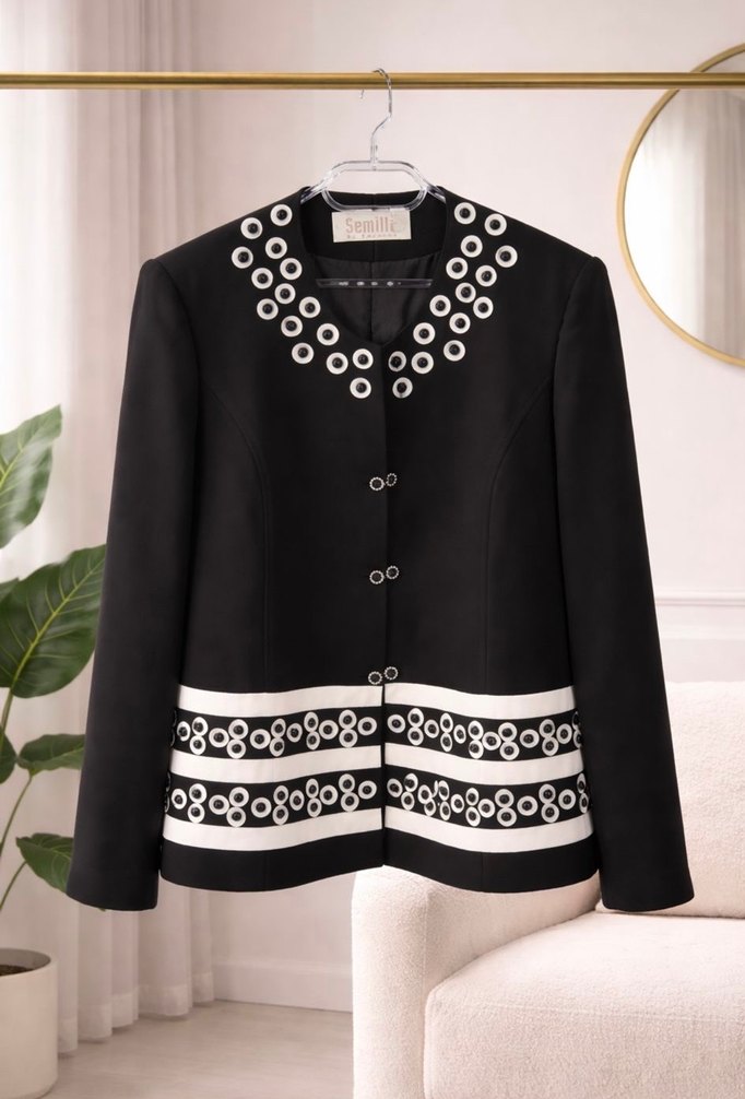 Düğmeli, uzun kollu siyah mini blazer. Bir kere giyildi. 50-54 beden