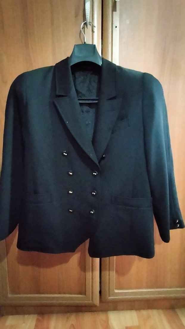 Siyah, düğmeli kadın blazer, ipeksi kumaş, kesik yaka ve kısa boy. Ofis için klasik ve gotik tarzda, uzun kollu ve düz desensiz.
