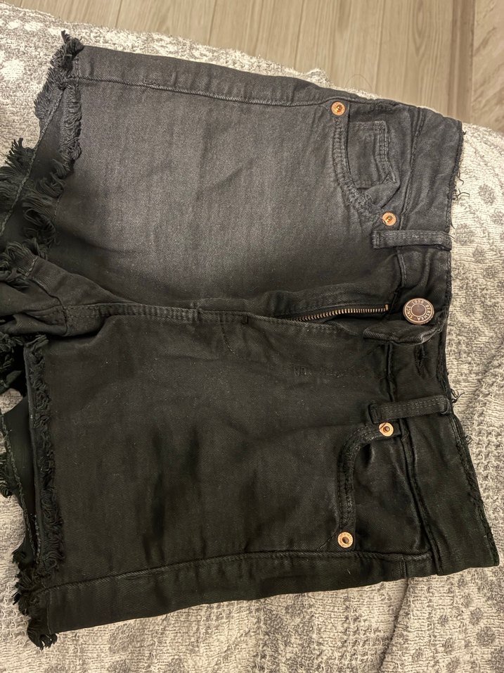 Düğmeli detaylara sahip siyah kot midi şort, rahat ve şık günlük sokak stili için uygundur.