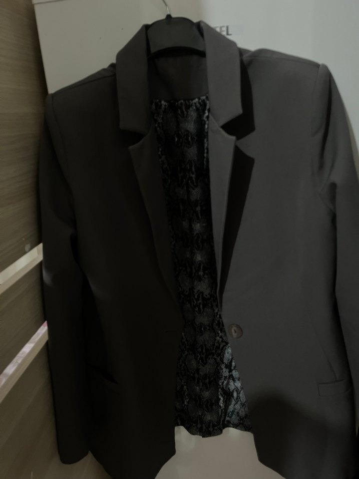 Düğmeli, normal boy, siyah kadın blazer. Notch yaka ve uzun kollu, sentetik kumaştan, ofis ve gotik tarz için uygun.