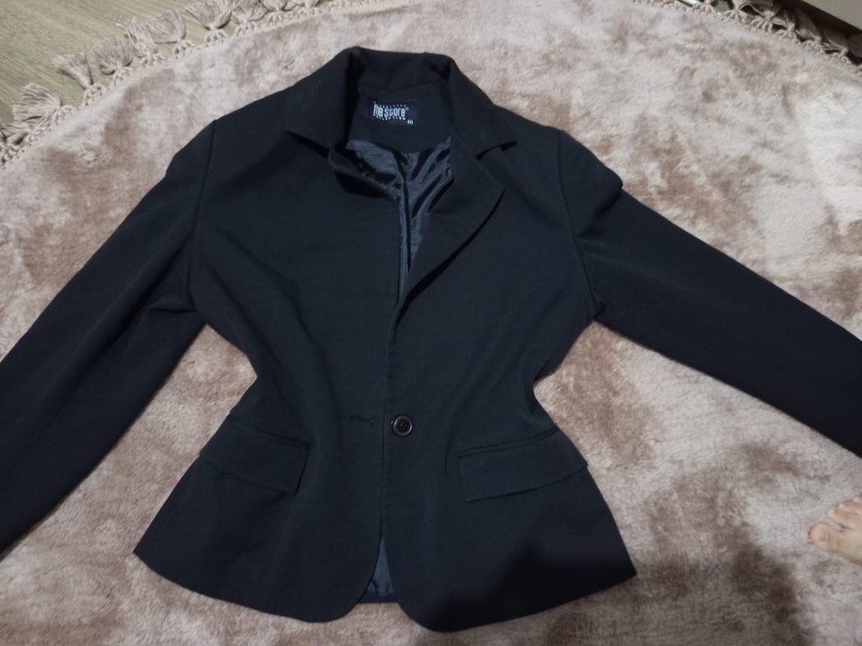 Siyah, düğmeli ve kesimli yaka detaylı kadın ofis blazeri. Uzun kollu, orta boy ve rahat kesimdir. Yumuşak ve sıcak kumaştan üretilmiştir. çok az kullanıldı
