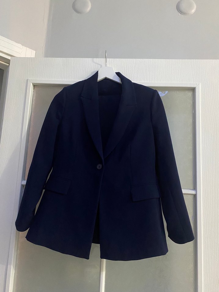 Düğmeli, normal boy midi uzunlukta siyah kadın blazer. Notlu yaka ve uzun kolludur. Sentetik kumaştan, ofis için uygundur.