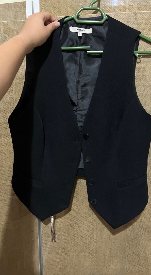 Düğmeli, siyah, normal boy, dar kesim yelek. Ofis için uygun, notched yakalı, sentetik kumaştan.