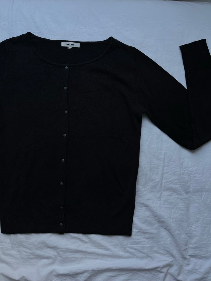 Hiç giyilmedi. Düğmeli önü, uzun kollu ve yuvarlak yakalı siyah pamuk hırka. Salaş kesimi ve midi boyu ile günlük kullanıma uygundur.