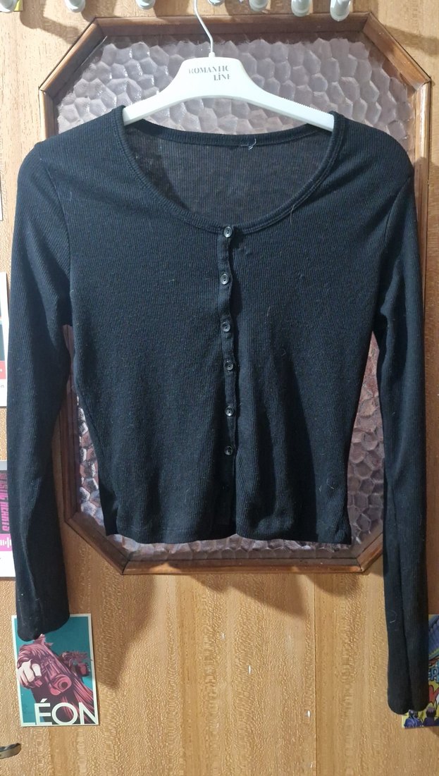 Pamuklu, uzun kollu, düğmeli, yuvarlak yakalı siyah kadın kazak. Günlük kullanıma uygun, fitted kesim ve goth tarzda rahat bir parça.