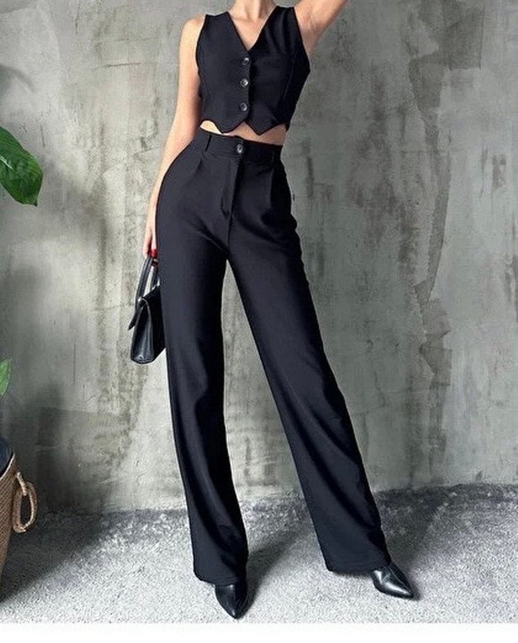Düğmeli Siyah Kadın Pantolon ve yelek takımı