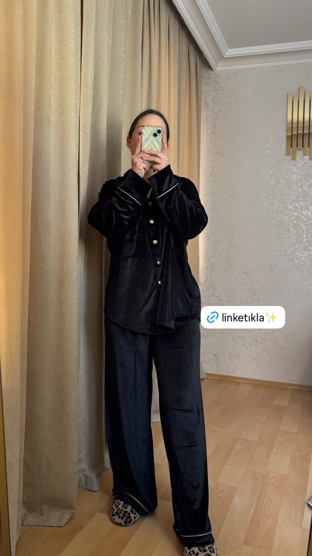 Düğmeli Siyah Kadın pijama takımı