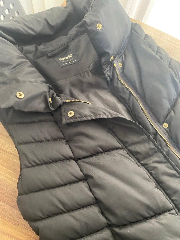 Düğmeli, yüksek yakalı, siyah puff yelek. Yumuşak fleece kumaştan, rahat ve günlük sokak stili için uygun.
