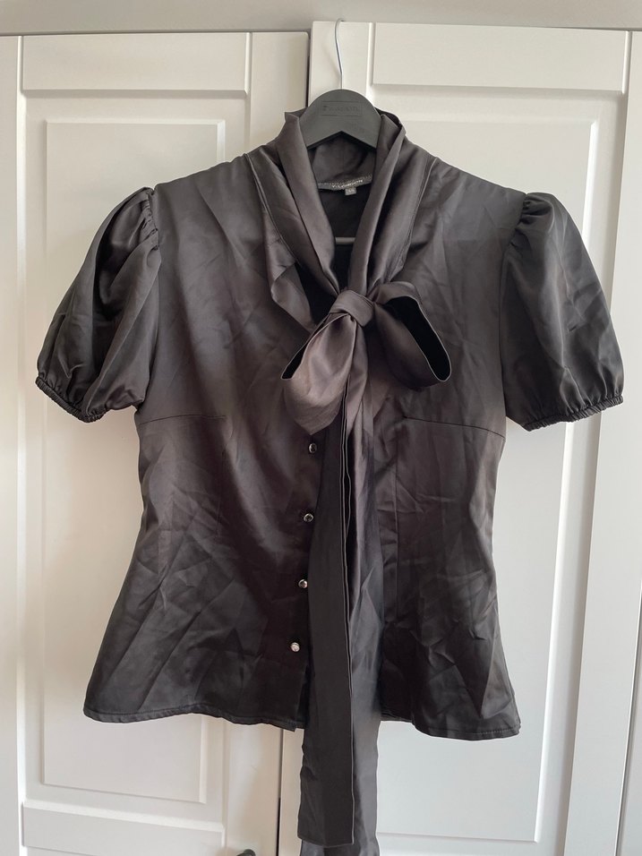 Siyah, düğmeli, ipeksi dokulu kadın gömlek. Halter yakalı, kısa balon kollu, fitted kesim ve midi boyda. Şık ve desen içermeyen tasarım ofis için uygun. Kolları lastikli önü siyah aksesuar fiyonk olabilen kadın saten gömlek.Y London markadır. Düğmeleri ışıltılı camdır.yakası dik yakadır.boy 55 cm göğüs 86 cm Bütün giyim ürünleri toplu satışa açıktır