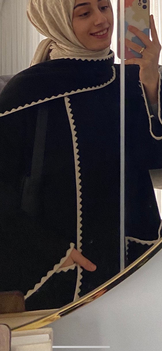 Düğmeli, saten dokulu siyah kadın şal, zigzag detaylı kenarlarla Parisli avangart şıklığını yansıtıyor.