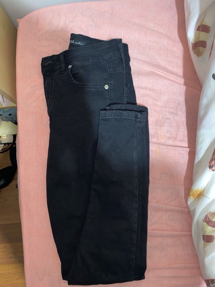 Düğmeli tasarıma sahip siyah, dar kesim kadın jean. Denim kumaştan, günlük sokak stili için uygundur. Biraz renk atması ve dizlerde sarkma var ama iş görür.