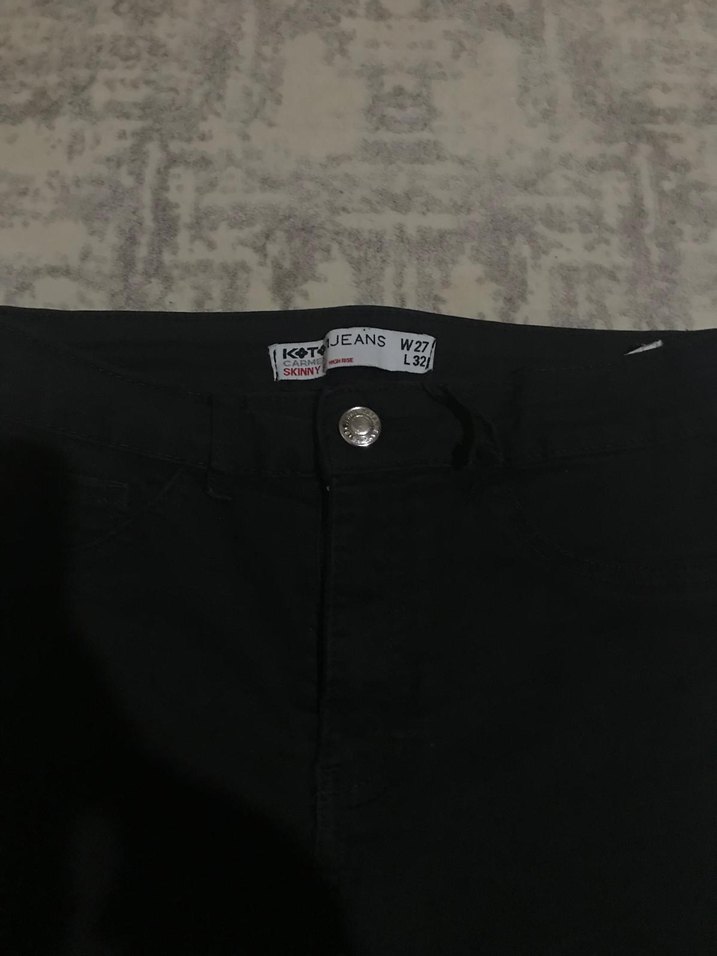 Düğmeli, normal midi boy, siyah kot dar pantolon. Minimalist ve sade tarzda, günlük kullanım için uygun.