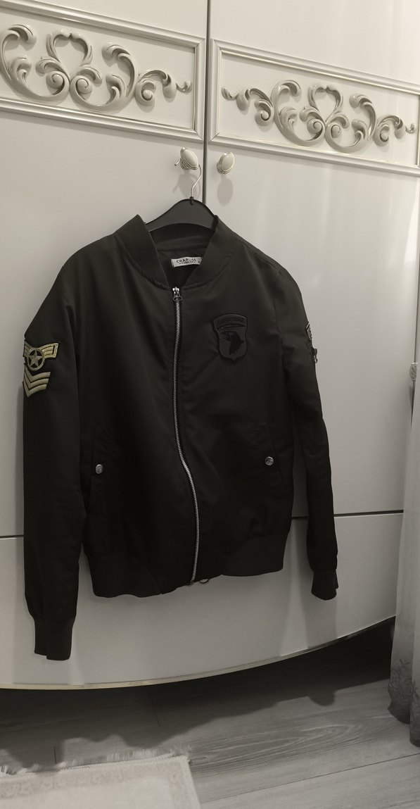 Düğmeli cepleri ve baskılı detayları olan, siyah, uzun kollu, crew neck, fitted kesim street wear ceket. Sentetik kumaştan, günlük kullanım için uygundur.