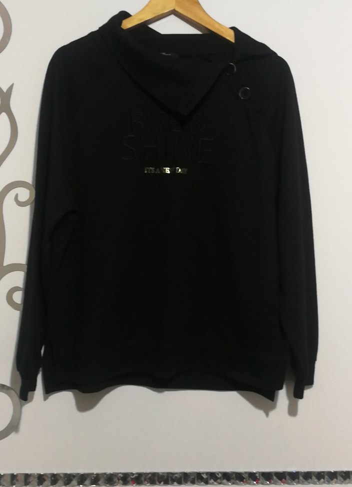 Düğmeli, uzun kollu, yuvarlak yakalı, siyah kadın sweatshirt. Rahat kesimi ve yumuşak dokusuyla günlük kullanıma uygundur.