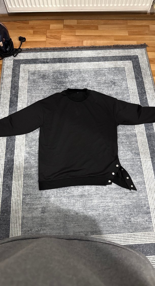 Uzun kollu, yuvarlak yakalı, yan tarafında düğme detaylı siyah kadın sweatshirt. Yumuşak ve sıcak kumaştan, rahat kesim.