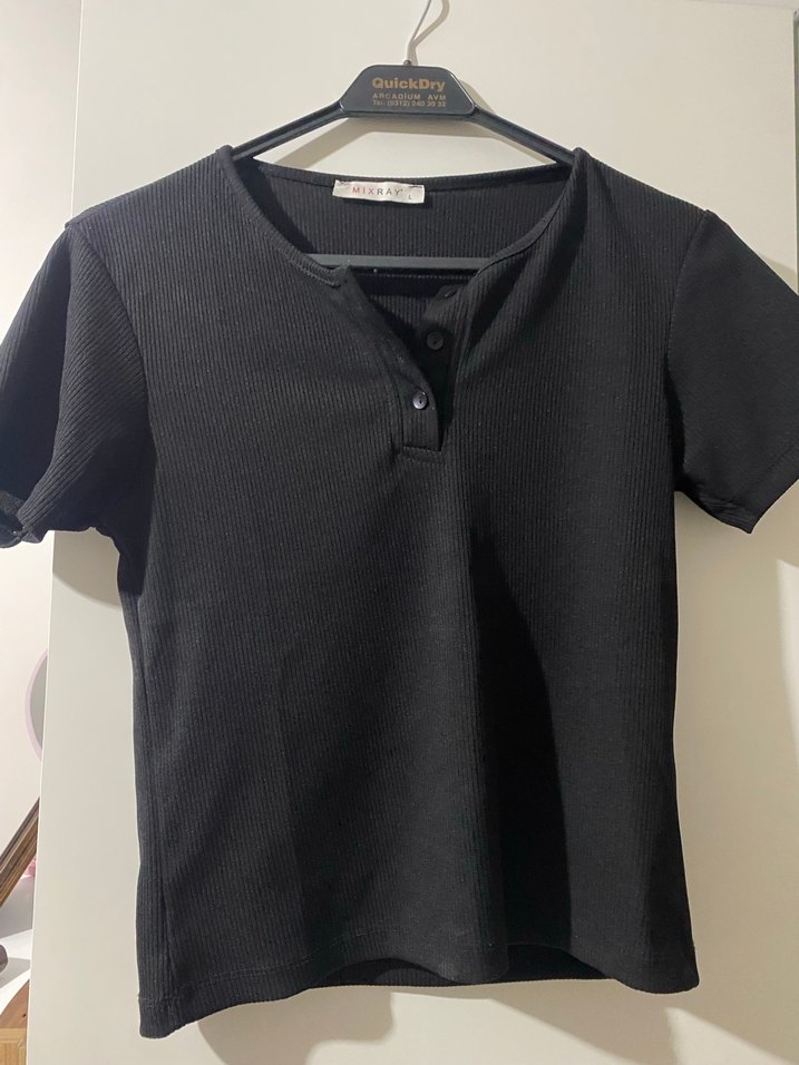 Pamuklu siyah kısa kollu tişört, yuvarlak yaka ve düğmeli detaylı. Salaş kesim ve normal boyda, günlük rahat kullanım için uygun.