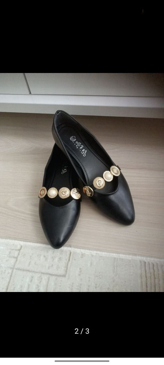 Siyah kadın babetler, blok topuklu ve altın düğme detaylıdır. Modern klasik tarzda, günlük kullanım için uygundur.