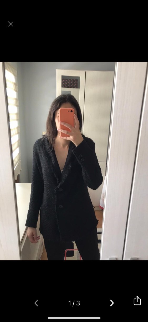 Bu siyah triko blazer ceket, kadınlar için düğmeli ve kesik yakalıdır. Uzun kollu, midi boyda ve regular fit kesime sahiptir. Ofis için uygundur ve desensizdir.