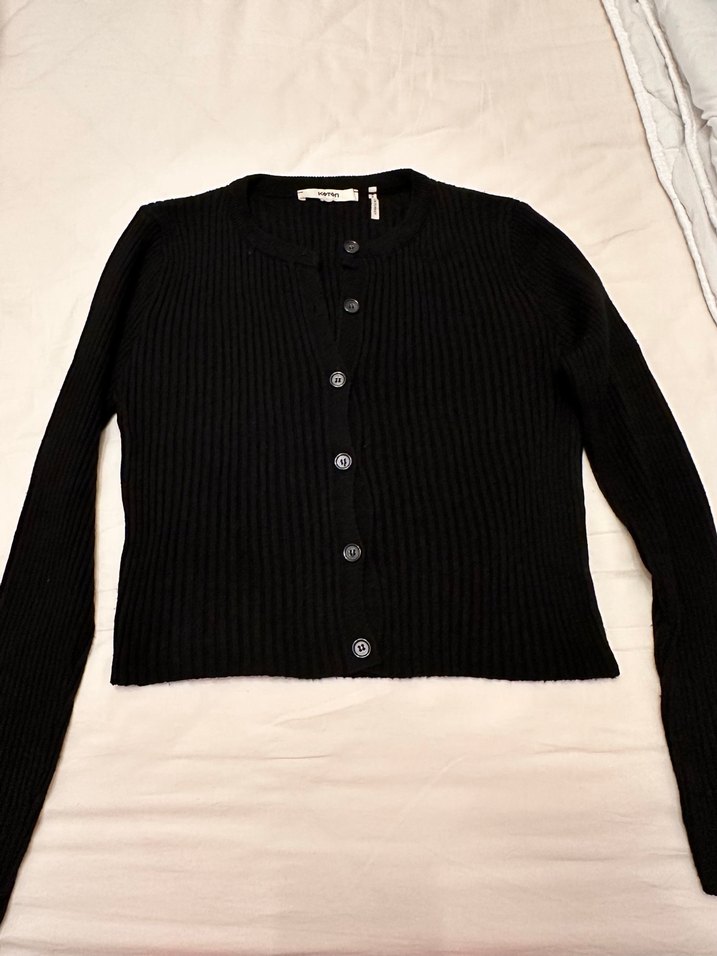 Siyah renkli, düğmeli, uzun kollu triko hırka. Yuvarlak yaka ve normal boyda, sade ve normcore tarzda, günlük kullanıma uygun.