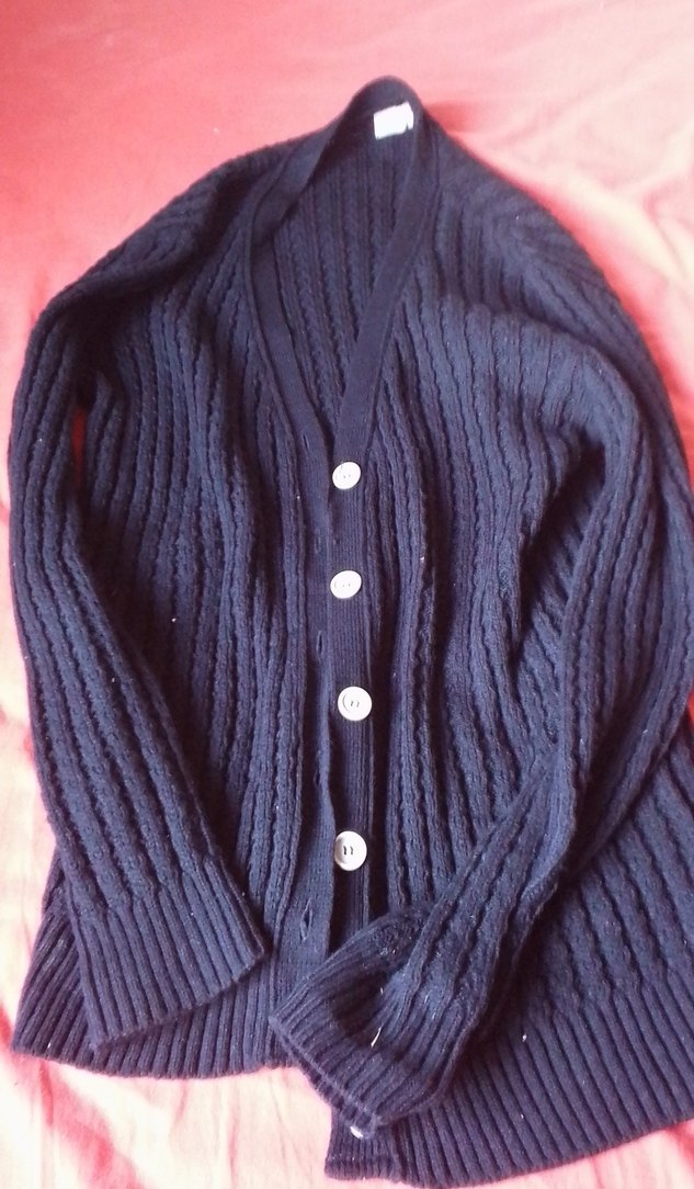 Bu siyah triko hırka, düğmeli ve kesimli yakaya sahip, uzun kollu ve vücuda oturan bir tasarımdır. Günlük kullanıma uygun rahat ve desensizdir.