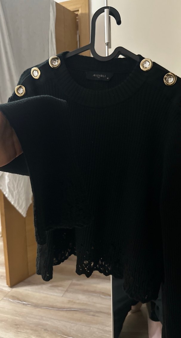 Dar kesim siyah triko kazak, yuvarlak yaka ve uzun kolludur. Omuzlardaki düğmeler ve etek kısmındaki dantel detayıyla gündelik gotik tarz sunar.