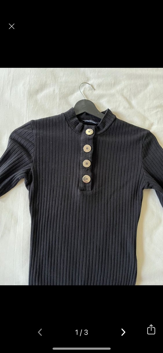 Düğmeli, yüksek yakalı ve kısa kollu, siyah kadın triko Tsört . Midi boyda, yumuşak sentetik kumaştan, günlük kullanıma uygun.