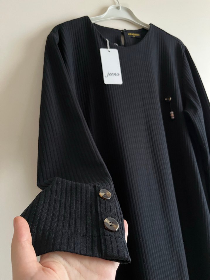 Siyah renkte, düğmeli manşetleri ve yuvarlak yaka detayları olan uzun kollu kadın triko tunik Rahat kesimi ve uzun boyu ile konforlu bir görünüm sağlar.