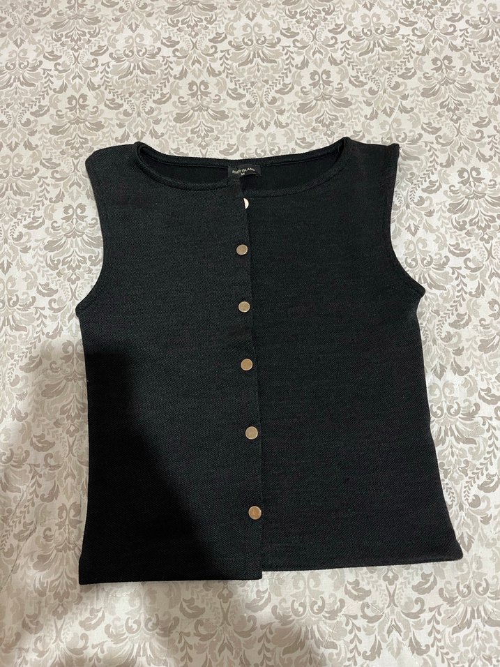 Düğmeli, bisiklet yaka, kolsuz siyah triko yelek. İnce ve vücuda oturan kesimiyle günlük kullanıma uygundur.
