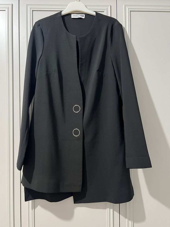 Düğmeli, siyah kadın blazer ceket. İpek gibi kumaş, yakası kesik ve uzun kol. Ofis için uygun, uzun ve regular fit. Hiç bir sorunu yoktur butik ürnüdür