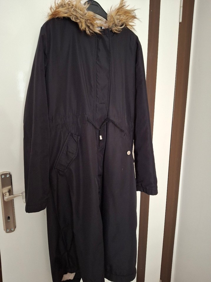 Kadınlar için düğmeli, siyah uzun ceket. Notlu yaka, uzun kollu ve ipeksi kumaştan üretilmiştir. Günlük kullanım için kürklü kapüşon içerir. Deformasyon yoktur az kullanıldı.