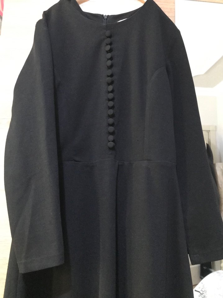 Düğmeli, yuvarlak yakalı siyah uzun elbise, uzun kollu ve düz kesimdir. Sentetik kumaştan üretilmiş, minimal ve ofis için uygundur.